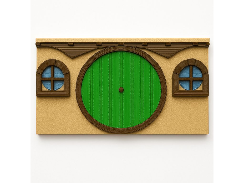 3D tištěný hobití domeček s kulatými zelenými dveřmi a dvěma okýnky. Dá se položit mezi keře, zapustit do svahu nebo jen postavit na polici. Hodí se jako zahradní dekorace, k dětským hřištím, k jezírku nebo prostě jen tak pro radost.